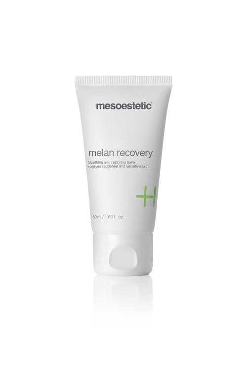 Mesoestetic Melan Recovery. Verzachtende en herstellende creme voor het verminderen van roodheid en irritaties. Zorgt direct voor een kalmerend gevoel. Herstelt de huidbarriere en geeft de huid comfort na o.a. peelingen en Cosmelan behandeling. Hij mag dan ook meerdere keren per dag worden gebruikt.